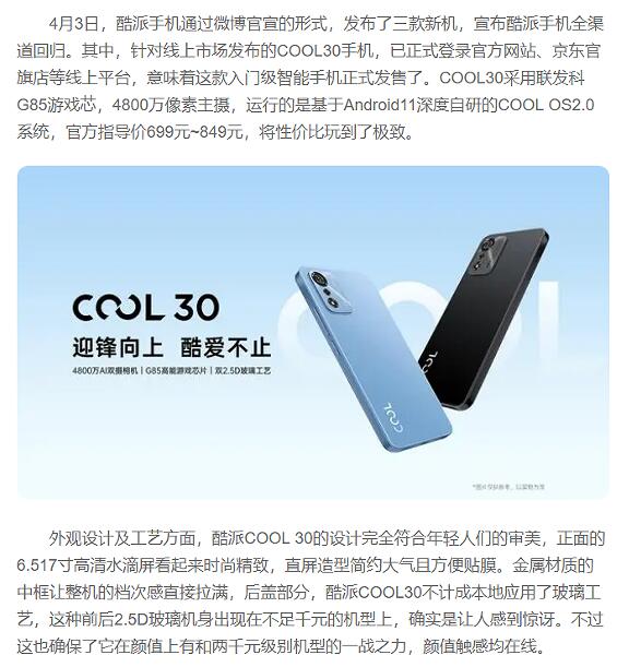 酷派Cool30上市,玻璃机身加持,颜值触感均