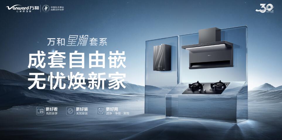综上,厨房厨卫家电市场在新时期的特点,为套系化产品的兴起提供了广阔的市场前景。随着家装旺季的到来,万和倡导“一体化家具美学”的同时,推出30年纪念款星瀚套系,将从多个维度上解决消费者的痛点和顾虑,成为许多用户的“秋天的第一套厨电”。