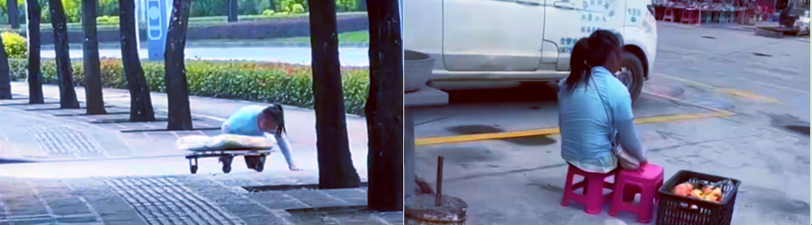 她无法像正常人一样自由地行走,短距离地出行则靠两个小凳子相互挪动;长距离出行靠的是一辆手工制作的四轮板车,人躺在上面靠手前行,平路的时候还比较轻松,不敢想象,若是遇到上下台阶那将是何等的艰难。
