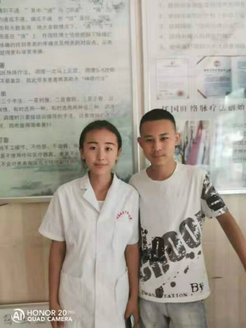 张昊然,今年16岁,遵化市燕山初三学生,上初一时发现近视的,右眼近视525度,左眼正常,并配戴眼镜2019年7月2号采用任国旺络脉疗法,调理前双眼裸视0.8,调理4次后双眼视力达到1.2,调理12次后双眼视力达到1.5,调理17次疗程结束,双眼视力达到2.0。地址:河北省遵化市民政局北行150米路东慧康经络按摩