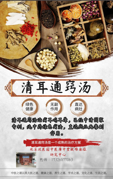 清耳通窍汤是一个成熟的治疗方案,是杨丽大夫针对耳聋耳鸣治疗了近四十的经验方,通过针对每一位患者的病情,身体状况,来辨证论治,同一病症的不同时期调整配方,达到一人一方,以辩证论治的原则,寒温并用,攻补兼施。清耳毒软化血管,溶解并排出耳脉内沉积的毒素,耳脉疏通,只要是采用清耳通窍汤治疗的患者,基本上用药的患者都是见到了不错的效果,所以说治疗耳聋耳鸣,经验,针对方面是重中之重。热线同微信