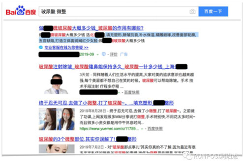 这是百度搜索“玻尿酸微整”跳出来的各种广告和文章,我们隐去品牌和人物,就从他们给出的功效中截取一段来说明吧。“填充塑形,除皱抗衰,补水保湿,精雕细琢,改善面部轮廓,五官缺陷,打造立体圆润网红少女脸……”