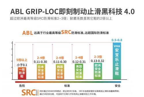 有了这些技术的加持,ABL止滑鞋所表现出的止滑能力超过了欧洲最高等级SRC防滑标准 2-3倍;耐磨系数也是其它鞋的2倍以上。再加上ABL止滑鞋底部特别设计的止滑纹理,共同形成了超强抓地力,大大提升了人们的行走稳定性。