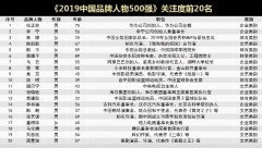为盘点和记录中国品牌人物(包含港澳台地区)2019年的年度表现,并对中国品牌人物进行一次系统梳理, 品牌联盟 于2019年12月18日在北京发布《2019中国品牌人物500强》榜单,此次是品牌联盟首次向社会公众发布该榜单。 品牌联盟选取我国5000余个知名品牌人物(包...