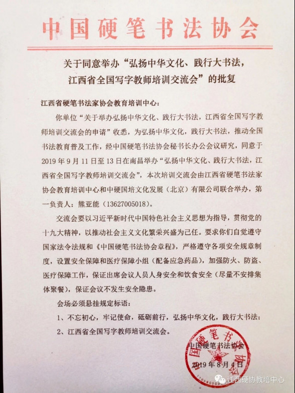 为贯彻落实党的十九大精神,落实《教育部关于中小学开展书法教育的意见》和《中小学书法教育指导纲要》精神,落实中国硬笔书法协会两大工作任务:一、让亿万人写好汉字、提高汉字书写水平;二、提高硬笔书法艺术创作水平,传承中华文化、践行大书法。切实推动中国硬笔书法协会关于“写字教育就是爱国教育”的“国培项目”稳步推进,充分发挥我会的组织和学术优势,推动我国书法教育领域的管理水平和教学水平科学、专业化建设。中国硬笔书法协会定于9月11日至13日在南昌召开【国培项目】南昌全国写字教师培训交流会。取得的证书,全国通用,终身有效,欢迎申报。