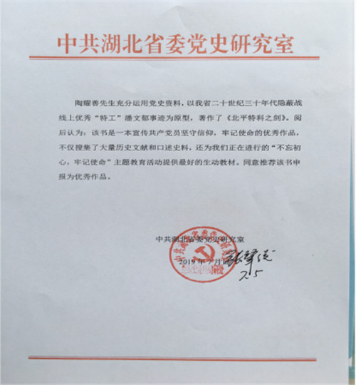 重温这段历史,阅读长篇小说《北平特科之剑》,正如“中共湖北省党史研究室”发文认为那样,该书“搜集了大量历史文献和口述史料”,“充分运用党史资料,以我省二十世亿三十年代隐蔽战线上优秀特工潘文郁为原型”,“是一本宣传共产党员坚守信仰,牢记使命的优秀作品”,“为我们正在进行的不忘初心、牢记使命主题教育提供最好的生动教材”。