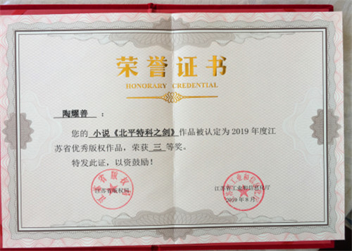 在江苏省委宣传部、江苏省版权局、江苏省工业和信息化厅联合发文(苏宣通2019第47号),组织申报2019年江苏省优秀版权作品工作中,长篇小说《北平特科之剑》一书经申报、审核推荐、专家评审、公示评审结果后,确定该书为:2019年度江苏省优秀版权作品,荣获三等奖。