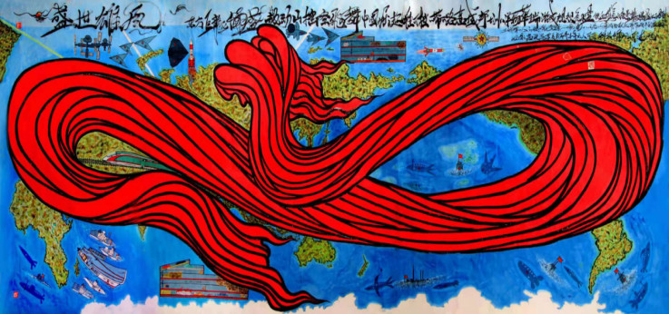 巛盛世雄风图巛一一一为2018年两会献礼与开放四十周年而作,为此图题诗一首一一一《盛世》一一一东方巨龍千年盛,地动山摇空飞舞,中国崛起谁可挡,一带一路惠域邦,游戏规则风水盘,铁血雄风汉唐景,龙腾盛世万国朝。丈六作品,长5米X2米宽,2018年2月18日作。