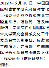 2019年5月26日至28日,中国国际报告文学研究会在北京隆重举行首届国学文化传承委员会委员代表大会暨“中华优秀传统文化寻根之旅”启动仪式。薄伽梵 智及维摩诘 宗师荣任组委会荣誉主席。