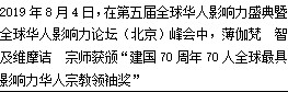 2019年8月4日,在北京隆重举行的第五届全球华人影响力盛典暨全球华人影响力论坛(北京)峰会中,薄伽梵 智及维摩诘 宗师获颁“建国70周年70人全球最具影响力华人宗教领袖奖”。