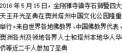 作我们双方如何促进相互了解和欣赏彼此文化的楷模。”时任塔州州长威尔·霍奇蒙在贺辞中赞誉:“此次开光圣典是塔州中国文化公园的里程碑。塔州人与中国人一起分享这持久和真正有价值的友谊。”