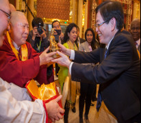斯里兰卡僧王Most Ven Wedaruwa Upali Maha NayakaThero专程从斯里兰卡率十位高僧参加开光圣典,为圣像开光作仪规加持,向 薄伽梵 智及维摩诘 宗师敬赠四项上座部国礼和斯里兰卡最高国礼——释迦牟尼佛祖真身舍利,共叙深厚法谊。