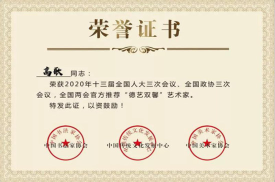 高歌先生自幼酷爱书法并有几十年的书法功底。由他构思独创的双手写双龙《二龍腾飞》和《十二生肖》象形书法并继承了传统与创新、兼取众家之长,简练生动,形神兼备,手法独特、苍劲有力、如行云流水栩栩如生。并被称为新时代有创意的书法家。高歌先生被国家文化部受为现其书法润格费每平尺为人民币3万元。作品曾多次参加国内外大型书画展并多次获奖,在港澳台成功的举办了个人《十二生肖》象形书法作品展、并被国内外政要、友人和国内艺术机构及个人收藏。
