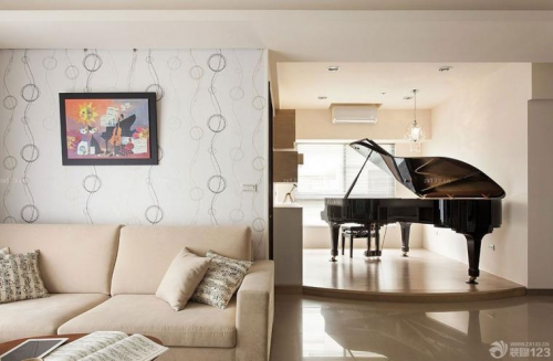 开放式琴房让宾客一进门就能感受到整个空间的浓浓艺术气息,也让日常生活中整体空间更加通透。采架高地板呈现,塑造展示台意象的设计主景。电视机背景墙水波纹的图案酷似声波的抖动在墙壁上呈现。布艺沙发温暖质朴,趣味插画背景挂画增加了空间的色彩丰富性。