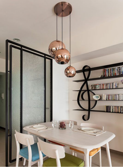 设计师在墙面施以细致铁工打造五线谱层架,音乐爱好者当然不能缺少放置自己心爱的CD的地方。搭配简约的乳白色的餐桌椅,小细节处运用了彩色的软布艺座椅,构筑清新北欧印象。