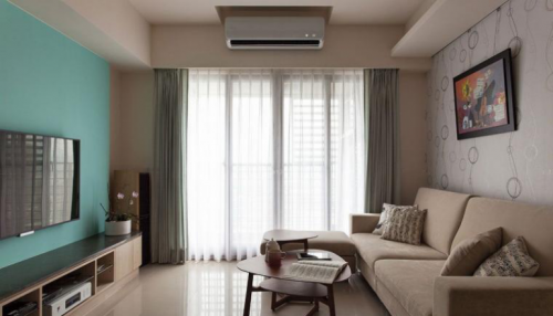 延续玄关墙面Tiffany蓝色系于电视墙,衔接内外空间。客厅处并没有过多复杂设计,质朴简单,符合屋主人的气质,卡其色的整体软装配色和窗帘背景墙也做到了呼应。