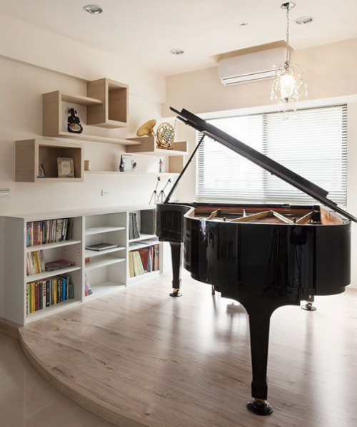 沿墙配置的展示层架,除了运用了高雅的卡其色点缀空间,更是采不规则线条收纳展示法国号等乐器,下方柜体根据未来使用需求采用活动层板作出调整。巨大三角钢琴陈放在空间中心,更体现屋主人对于音乐的热爱以及音乐的重要性。