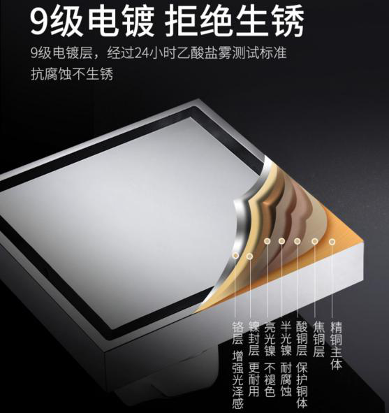 除此之外,地漏的耐用性也无需担心,采用精铜材质,通过红冲技术一体成型,再通过9级电镀,抗腐蚀能力非常优秀。