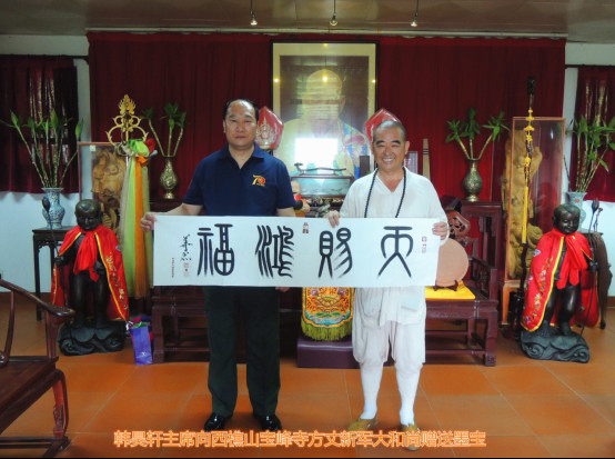 韩昊轩主席一行在佛山期间,在佛山分会主席杨晓红、外联部主任韩国华陪同下参观了佛山市国家AAAAA级西樵山风景名胜区、宝峰寺、中央广播电视总台南海影视城、花卉世界、南风古灶等。感谢西樵山宝峰寺方丈新军大和尚、世界华人书画家协会佛山分会理事、佛山市凯运达物流有限公司董事长刘凯、佛山路玺运输董事长林志钢、佛山企业家赖总、宋总、刘法德、赵荣君、刘伟、王大全的热情接待。