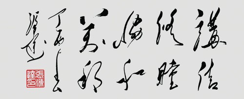 张源达草书,是草书书法由狂草而再生萌新的创建实践。用笔的连贯与毫锋的使转,都是典型的草意笔法,字形渐渐调大,把草书写成榜气势,称谓大草,名副其实。大草之法,自古不多见,张源达结合现代审美框架和富有天资的笔墨才华,大胆拓展,终有成就,在大草视界一举立顶,令人敬仰。