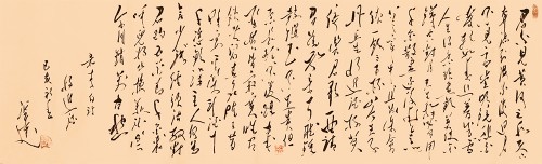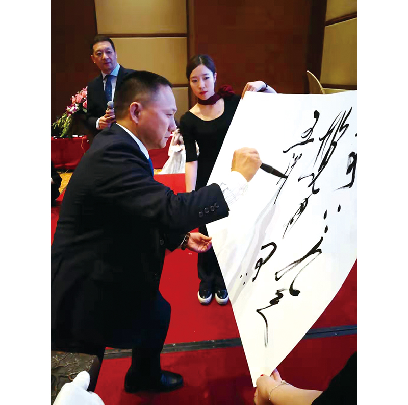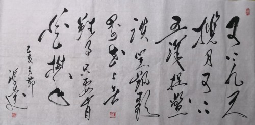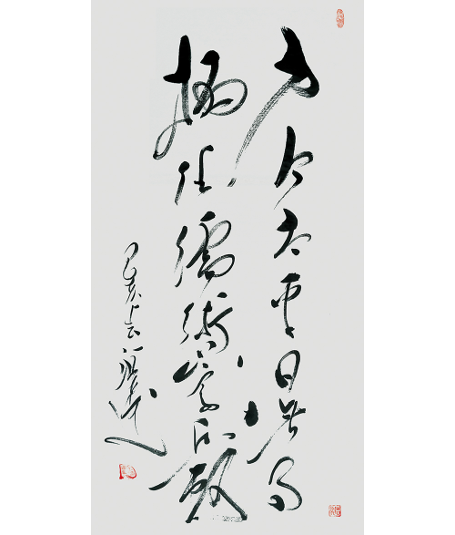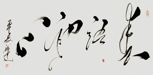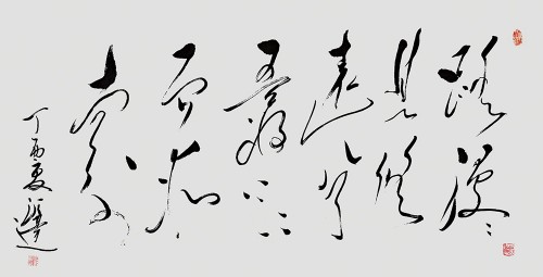 特别是他对毛体草书的深刻研究,让他在创建大草大功的过程中,尽展伟人书风的精神品质,雄迈倾志,书以言志,精气神皆入法门,成为当下草书趋“大”的端华精品,是大而不陋,大而不粗的细功精确。他的草书结体构字,大而求简,线符表达非常到位,用笔轻快,驱墨如神,笔画连绵,一笔呵成,极是痛快。