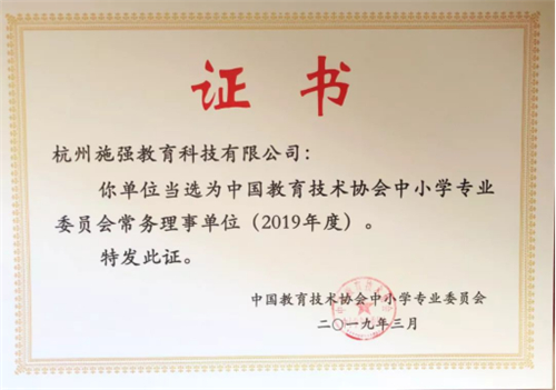 2019年3月20日,在中国教育技术协会中小学专业委员会常务理事会议上,杭州施强教育科技有限公司成功当选“中国教育技术协会中小学专业委员会常务理事单位”。