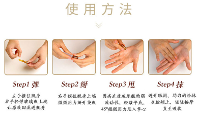 涂抹式玻尿酸的使用方法相比针剂类容易了不少。只需要取一支宝娇玻尿酸原液安瓶,轻轻将原液甩回瓶中,捏住两端掰开,倒入搓热的掌心,在脸上打圈按摩吸收就行啦。