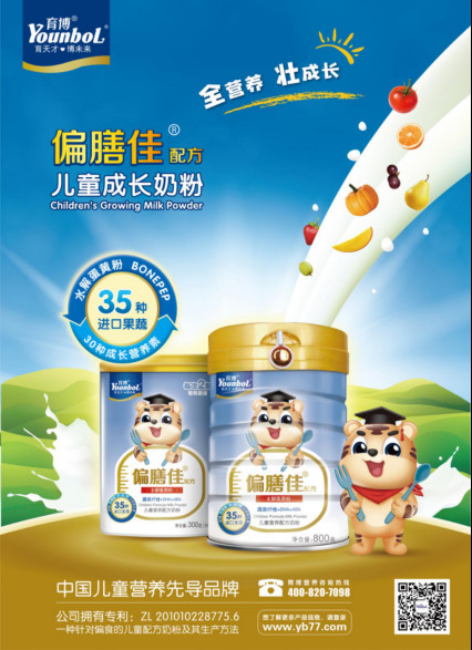育博偏膳佳儿童配方奶粉是根据中国儿童的饮食营养状况,结合中国儿童易偏食、易挑食、难纠正的特点研发的一款营养奶粉。产品以北纬45°黄金奶源带的新鲜牛奶及脱盐乳清粉为原料,通过干湿法复合工艺生产,锁留新鲜。添加维生素A、维生素D、维生素C、维生素E、B族维生素等多种维生素及钙、铁、锌、牛磺酸、DHA、ARA、益生元、水解蛋黄粉、35种果蔬等30多种营养素全面补充儿童所需营养,关注儿童偏食、抵抗力、智力、身高等的发育。