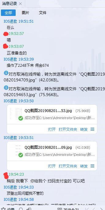 对方取消在线传输,转为发送离线文件“QQ截图20190820194653.jpg”(75.96KB)。