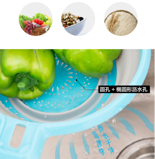 双篮搭配用途广泛,适合用来焯水、洗水果、蔬菜、五谷,由于其圆孔+椭圆形沥水孔,流速快,同时沥水干净,食物上不残留水渍。