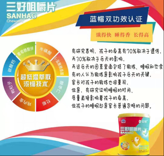 在管理孩子身高之前,首先要了解到影响人体身高的重要因素,孩子的身高与营养,运动,睡眠,情绪息息相关,而其中最重要的就是营养和睡眠。很多家长就有给孩子补钙的意识,但是很少有家长知道,人体中的“生长激素”才是身高的真正操纵者,生长激素是脑垂体前叶分泌的一种蛋白质激素,也是唯一一种使骨骼线性增长的激素,如果没有生长激素,不在多的钙也没有效果,而孩子的深度睡眠的时候才是脑垂体分泌生长激素做多的时候,缺乏生长激素就会导致生长发育缓慢、身材矮小。三好咀嚼片所含的赖氨酸可以促进脑垂体分泌生长激素,而酸枣仁可以养心安神让孩子情绪好,睡眠好,从而帮助孩子长高。