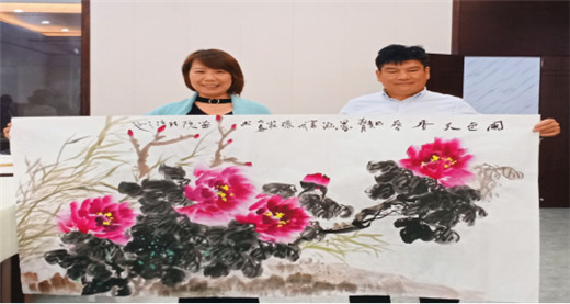 世界华人书画家协会江苏分会副主席李墨涵女士向力泰实业董事长张福深赠送墨宝