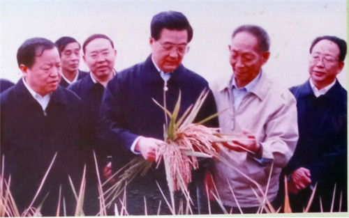 科普教育基地主任程勇军向韩昊轩主席一行介绍袁隆平院士的个人成就