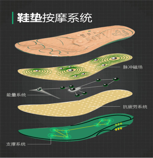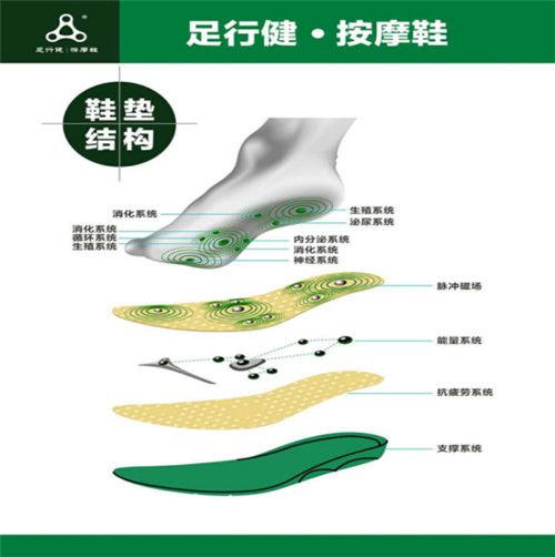 足行健按摩鞋按摩功能实现的核心在于鞋垫,每一个足行健按摩鞋垫,都有一套完整的按摩系统,这套按摩系统包含了按摩点、能量磁场、抗疲劳支撑系统。