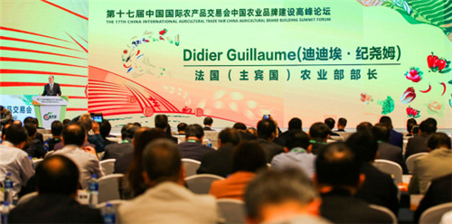 11月15日下午,中国农业品牌建设高峰论坛在江西国际博览会绿地铂瑞酒店举行。会议主题是,第十七届中国国际农产品交易会。会议由农业农村副部长于康震主持。江西省委副书记、省长易炼红致辞,法国农业部部长迪迪埃纪尧姆致辞,农业农村部部长韩长赋做主旨讲话。甘肃省委副书记孙伟、河南省副省长武国定、中国农业科学院副院长吴孔明、中粮集团有限公司副总裁陈朗、北京首农食品集团董事长王国丰等先后发言。
