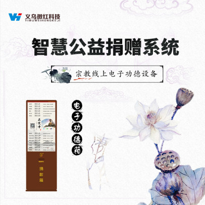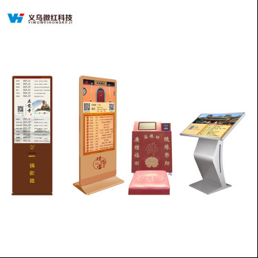 义乌微红科技电子功德箱采用广告机的外形,由底座加机身,内嵌液晶屏组成,两个成年人可轻松抬起移动。液晶屏上可显示捐赠二维码,善款可以链接到寺庙的对公账户,具备安全性;还可以轮播寺庙的图片,播放音乐。来拜佛行善的人在捐赠时,捐赠人可填写姓名、祈福语、捐赠金额,捐赠后实时出现在屏幕上对于捐赠人来说也是一个不错的体验。