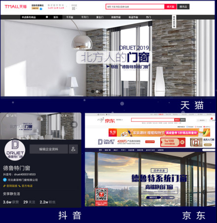 德鲁特门窗成功入驻天猫和京东平台,专业电商团队运营,从天猫、京东、抖音等平台引流终端,经销商坐享精准客户资源。