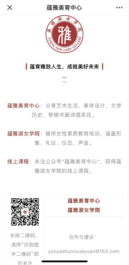等方面进行全方位讲解。蕴雅淑女学院与全球旅游文化小姐奉行“身心和美内外兼修”的美丽箴言不谋而合。学院会不定期举行文学沙龙,红酒品鉴,中西方茶道和历史讲座,希望每一位蕴雅淑女学院的学员,通过在蕴雅的不断熏陶和学习能够获得好形象、好修养、好品味、好人生。