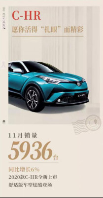 高享受,低负担,C-HR可谓买到就是赚到。2019年1-11月累计销量达到了55477台,其中11月销量达到了5936台,同比增长6%。在消费升级的大趋势之下,成为了各路潮人争相追捧的对象。