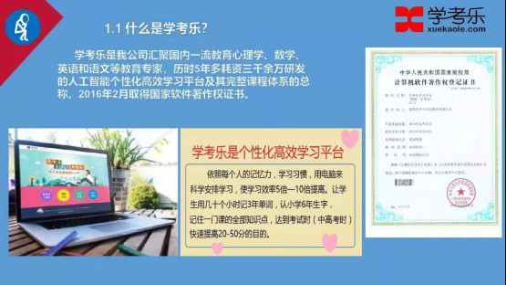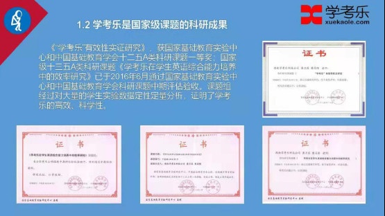 学考乐汇聚国内一流教育心理学、数学、英语和语文等教育专家,历时 5 年多耗资三千余万研发的个性化高效学习平台及其课程体系的总称。2016 年 2 月取得国家软件著作权证书。《“学考乐”有效性实证研究》,获国家基础教育实验中心和中国基础教育学会十二五 A 类科研课题一等奖。学考乐旨在打造全国最大的教育学习平台,为全国更多的学校提供最好的课程,让中国更多的学生都可以用学考乐学习,快速提升成绩!
