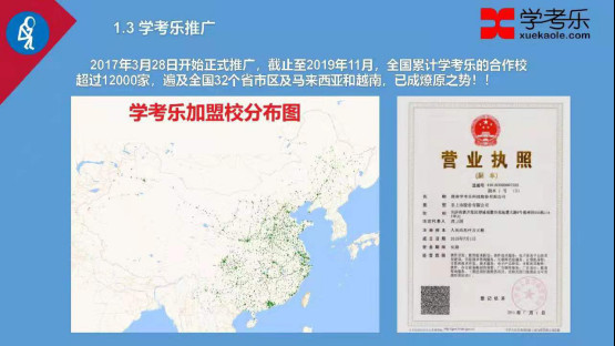 学考乐从2017年3月28日上市推广,截止目前全国加盟校9000多家,一万多个学考乐校区,是国内英语培训行业人工智能教学行业中非常受欢迎的。
