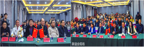 世界华人书画家协会主席、联合国华人文化产业联合会主席、香港华人杂志社社长兼总编韩昊轩、瑶盛文化产业园董事长吴永明、徐州市旅游协会副会长、徐州市丰县政协委员、徐州市妇联人大代表、瑶盛文化产业园总经理余志琴、丰县青商会会长王治国、徐州市文体广电和旅游局、丰县县委、大沙河镇党委等领导参加年会并分别致辞和讲话。本次活动由世界华人文化艺术团团长、世界华人书画家协会副主席、武警文工团导演、著名男中音歌唱家高歌、世界华人书画家协会江苏分会秘书长吴薇莉主持。