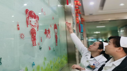 输液室门口也贴上福字,为输液患者祈福。