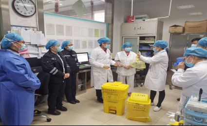 院感科刘智文科长深入临床一线指导做好疫期医疗垃圾处理。