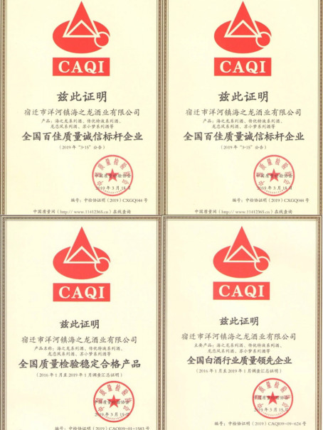 海之龙酒业有限公司旗下“苏小梦”品牌凭借优秀的产品质量受到中国质量检验协会的高度肯定和认可,获颁“全国白酒行业质量领先企业”、“全国质量检验稳定合格产品”、“全国产品和服务质量诚信示范企业”、“全国百佳质量诚信标杆企业”证书,展现出海之龙酒业有限公司及其产品深受政府、业界、客户和社会公众认可的标杆影响力。