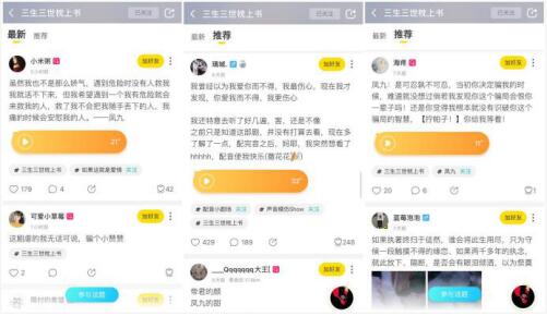 玩吧有一群经常在广场里发一些古风歌曲或古风配音内容的年轻人,虽然他们并没有经过专业、系统的学习,但积极模仿、勇于尝试,有些作品还算优质。本次活动中,当然少不了他们的身影,他们纷纷在广场话题下发挥“戏精”的特长,将一段段感人的台词经过再次创作演绎出来,有趣极了,这一行为也收获了不少有共同爱好的小伙伴。