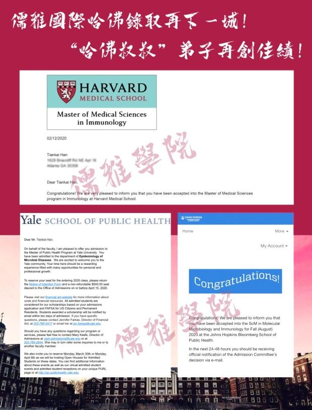 正值新冠肺炎肆虐的这个冬天,全国人民共同抗击疫情,武汉加油!中国加油!钟南山院士一直在抗战新冠疫情的第一线,并与美国哈佛大学联手寻求对抗新冠肺炎疫情的更好诊断和治疗方案。哈佛大学医学院也向儒雅学院学生韩天凯伸出橄榄枝,录取他为免疫医学科传染病方向学生。韩天凯同学凭借在儒雅学院的优异成绩,对医学的强烈兴趣,对社会弱势群体的关心,被美国哈佛大学、耶鲁大学、约翰霍普金斯大学等世界多所顶级大学医学院录取。