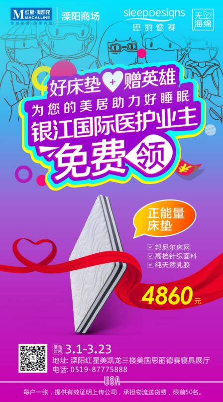 当疫情来临之时,医护人员直面病毒,将危险揽上己身,为我们筑起一方安全天地,他们的血肉之躯此刻仿佛铜墙铁壁。我们天天从各种媒体知晓疫情信息,生活虽然紧张,生命却无忧。医护人员用血肉之躯将大部分病毒挡在人们的生活之外,因此思丽德赛则发起了免费向医护业主赠送床垫的活动,3月1日至3月23日,只要你是江苏溧阳银江国际、天隽半岛、中粮香缇或是江苏金坛中梁壹号、新城金郡、紫玉华府小区的医护业主,或江苏南通海门御园、碧桂园、雅居乐的医护业主,即可凭有效证明登记尊享一张市价4860元的思丽德赛床垫。只需承担物流送货费用,思丽德赛会将床垫送到家中!同时思丽德赛将对部分活动现场进行直播,届时将对此次活动进行详尽说明。请留意直播地址和时间。相信当医护人员拥有了好的睡眠,他们就能够更加精神抖擞的去战斗,并平安凯旋。