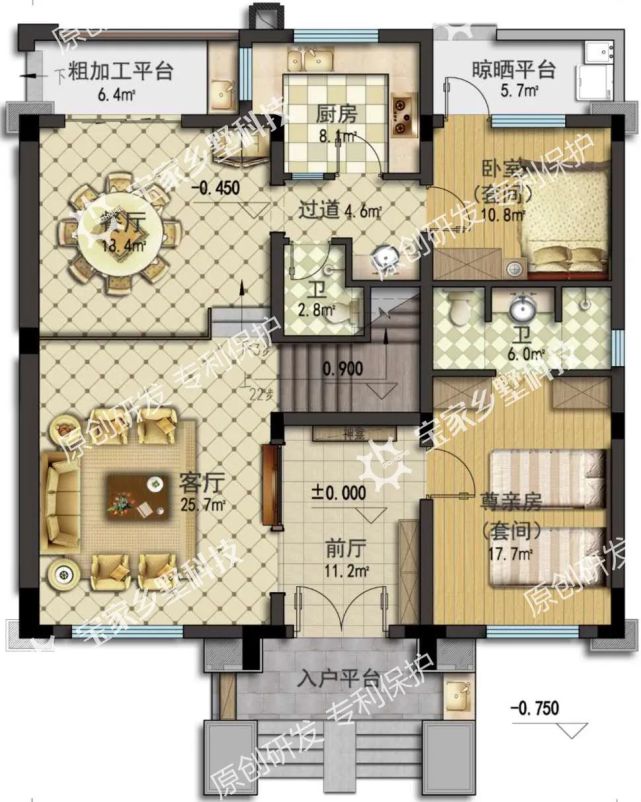 仅一楼就含「2个」套间,特设尊亲房,搭配双床设计,方便长辈彼此安睡还能相互照顾。另有「3大」平台配置,防疫入户/生活晾晒/厨房粗加工,便利十足。