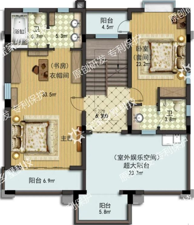 二楼配置「3个」个大套间,且每间均带独立卫生间和阳台,专属打造贴心私人空间。
